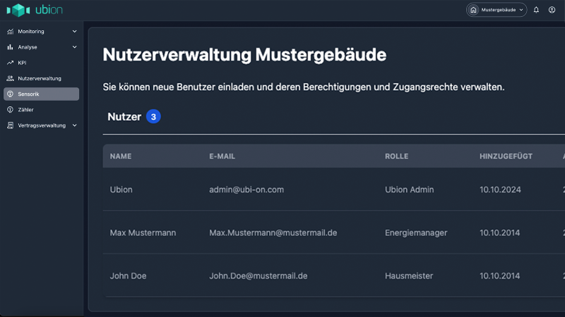 Definieren Sie Rollen mit fein abgestuften Zugriffsrechten – von Leserechten bis Admin-Funktionen. Nutzer laden Sie per Self-Service ein und verwalten sie zentral. Je nach Berechtigung sehen Anwender einzelne Gebäude oder gebäudeübergreifende Daten, passend für Facility-Management, Rechnungswesen und Energiemanagement.